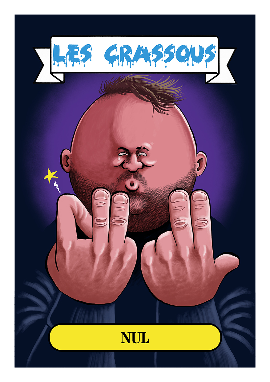 En 2019, j’ai eu l’idée de faire une parodie politique des Crados de mon enfance. Ça donné les Crassous, une trentaine de portraits de nos chers personnages politiques et médiatiques. J’ai même eu le droit à une fermeture de ma page Facebook, suite à la publication du Crassou “Patrick Balkanus”. Mais cela n’a pas empêché les Crassous de s’exposer à Nantes à l’été 2020 et les Crassous vont même prochainement connaitre leur moment de gloire puisqu’ils auront leur chapitre dans le livre de l’historien de l’art Ido Noy sur l’impact des Crados sur la satire politique ! Petit aperçu ci-dessous (je vous ai épargné les pires ^^)